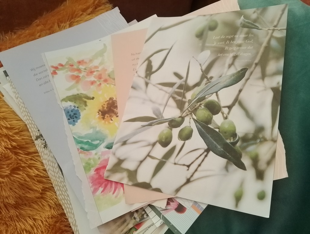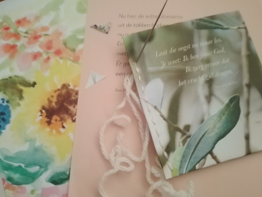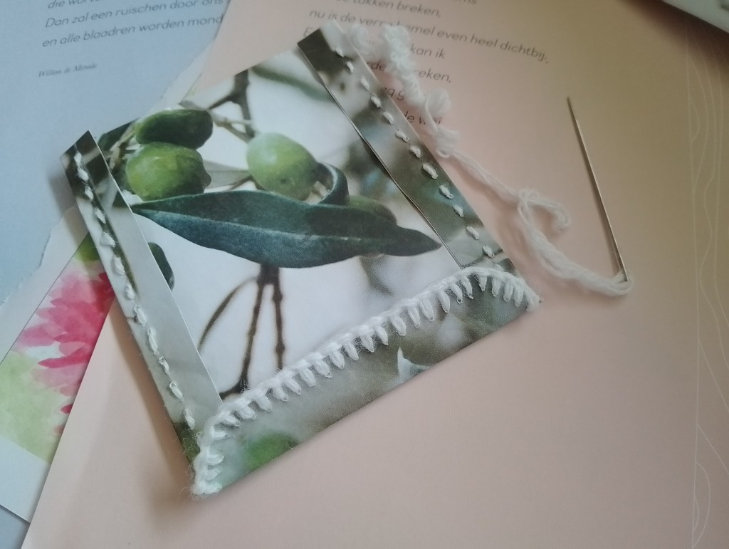 Voor de zakjes is het vooral belangrijk om stevig papier te gebruiken. Ik heb zelf een aantal tijdschriftpagina’s met vrolijke prints en gedichten verzameld. Zo eens in de zoveel tijd scheur ik tijdens een opruimsessie dergelijke A4-tjes uit tijdschriften om ze vervolgens vaak alleen te bewaren of op een prikbord te hangen. Nu ik precies ook zaad aan het verzamelen was, kwamen die twee samen tot het idee van de zaadzakjes. Voor de zakjes heb je behalve stevig papier ook wol of touw nodig in een kleur die past bij jouw papier. Daarnaast is een lange naald met een scherpe punt geen overbodige luxe. Ook een prikpen kan handig zijn, als je die hebt. Kortom, je boodschappenlijstje bestaat uit: